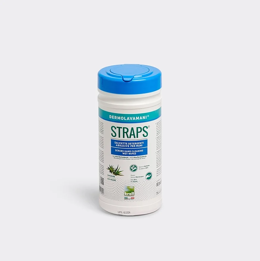 Straps® is a non-woven fabric wipe, slightly abrasive on one side and soft on the other, impregnated with a highly effective cleansing solution. It removes all types of dirt in many sectors, from industrial to automotive and DIY. Straps® wipes are a practical tool for cleansing hands quickly, without water. The product is particularly effective for removing oils, tar, glue, fresh paint, varnish, silicone, ink and grass stains. It also removes the smell of gasoline and diesel from hands, leaving them pleasantly scented. They are also effective for cleansing work tools and surfaces. Straps® wipes are dermatologically tested for skin compatibility and enriched with emollients, natural moisturizers and aloe extract.