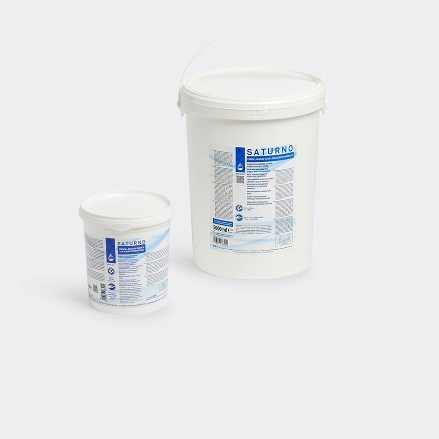 La crema lavamani bianca con abrasivo minerale della linea Saturno è un detergente concentrato, efficace contro qualsiasi tipo di sporco ostinato per i settori industriali come: automotive, oleodinamica, aereonautico, navale e in molti altri contesti. La crema lavamani Saturno contiene saponi e tensioattivi di origine vegetale ottenuti da fonti rinnovabili, oltre ad abrasivi a base di microgranuli inerti per detergere con efficacia le mani; questa formulazione lascia le mani morbide e piacevolmente profumate.